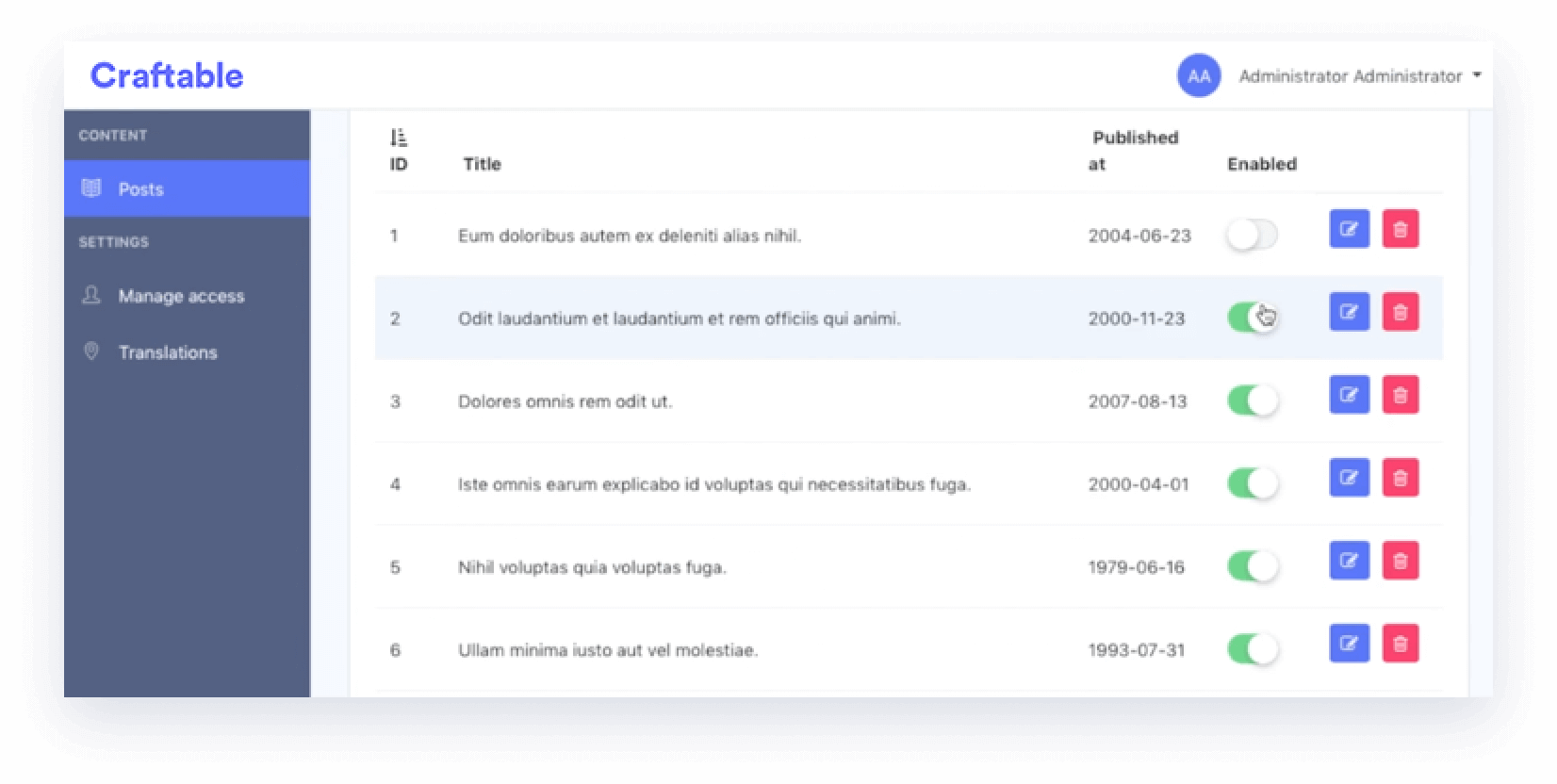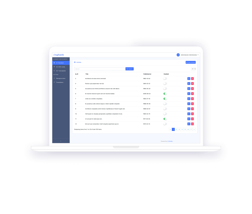 We believe that minimalism ensures higher flexibility when implementing your ideas. That's why Craftable only ships - by default - with two ready-to-use-after-install features: authorization and User CRUD. It also bundles UI components and PHP packages, which accelerates the development of your admin interface.